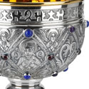 Chalice, crafted by the talented artisans of Molina Artistic Silver, adorned with bold Germanic ornamentation, symbols of the Four Evangelists on the base and highlighted with genuine stones. Finished in silver plate with gold lined inner cup. 6-3/4" height x 5-1/8" diameter cup, 20 ounce capacity. Comes with 6-1/4" Scale Paten with Ring. Made of brass, brass with a sterling silver cup or all sterling silver. Please select. Please inquire to info@cosgraves.net or Toll Free 800-228-9785 for information on customization. Crafted in and imported from Spain. It is subject to appropriate declaration, duties and taxes required by U.S. Customs. To ensure your order is appropriately charged, or exempt, please include your FEI # in the comments section. NOTE: If you already have an established account with us we have this exemption number on file. INTERNATIONAL SHIPPING DOES NOT QUALIFY FOR FREE FREIGHT.