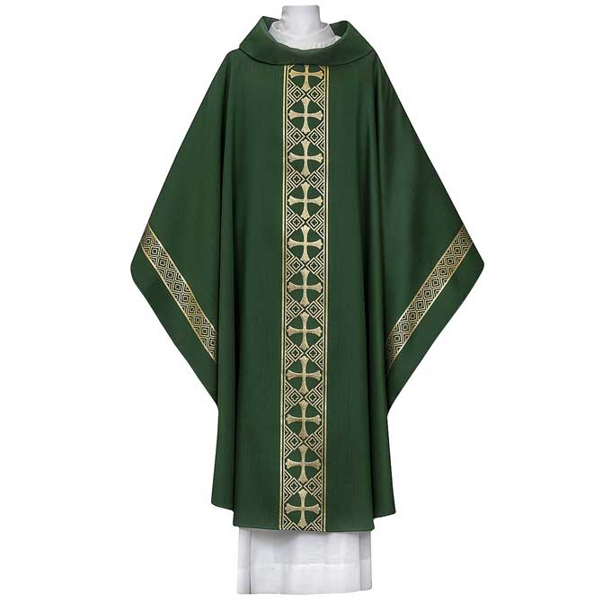 Forest Chasuble from the Arte Houssard Collection made in a beautiful, lightweight wool blend (80% polyester, 19% wool, 1% lurex). The orphrey has a gold cross design on the front and back. There is a simple, yet elegant, gold band design at the sleeve. Comes with an Inside Stole. Ample Gothic Cut. Standard size is 53" length x 61" width. Sold here in forest. Shown with cowl neck, also available with plain neck. Please select neck finish. Other matching ecclesiastical vestments are available. Please inquire to info@cosgraves.net or 800-228-9785. This item is crafted in France and imported from Belgium. It is subject to appropriate declaration, duties, tariffs, and taxes required by U.S. Customs. To ensure your order is appropriately charged, or exempt, please include your FEI# in the comments section. NOTE: If you already have an established account with us we have this exemption number on file. Items shipped from Europe do NOT qualify for free freight.