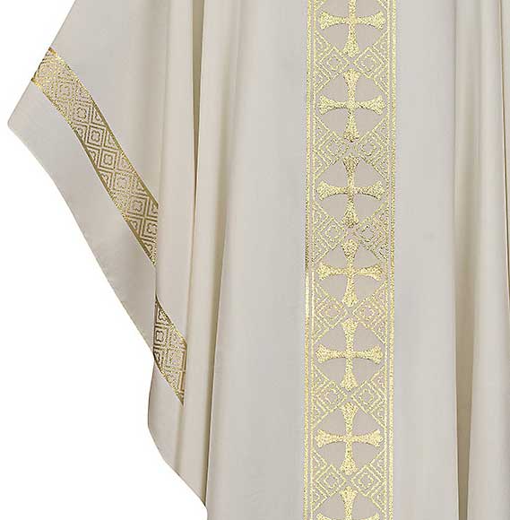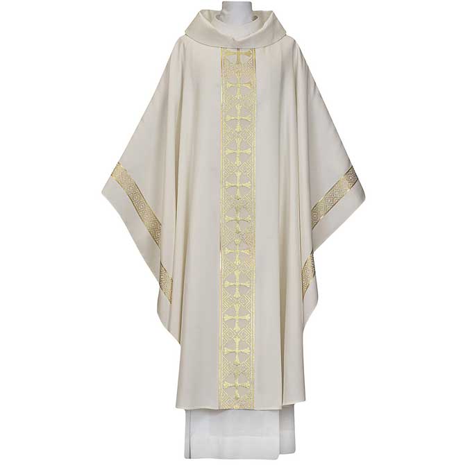 White/Gold Chasuble from the Arte Houssard Collection made in a beautiful, lightweight wool blend (80% polyester, 19% wool, 1% lurex). The orphrey has a gold cross design on the front and back. There is a simple, yet elegant, gold band design at the sleeve. Comes with an Inside Stole. Ample Gothic Cut. Standard size is 53" length x 61" width. Sold here in White/Gold. Shown with cowl neck, also available with plain neck. Please select neck finish. Other matching ecclesiastical vestments are available. Please inquire to info@cosgraves.net or 800-228-9785. This item is crafted in France and imported from Belgium. It is subject to appropriate declaration, duties, tariffs, and taxes required by U.S. Customs. To ensure your order is appropriately charged, or exempt, please include your FEI# in the comments section. NOTE: If you already have an established account with us we have this exemption number on file. Items shipped from Europe do NOT qualify for free freight.