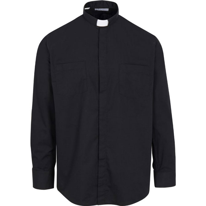 Clergy Shirt with a tab collar. This high-quality black shirt features a full-cut design, long sleeves, and two breast pockets. It is tailored to provide a perfect fit for various body types. Ecclesiastical Apparel offers high quality shirts using an exquisite fabric and superior craftsmanship. The luxurious 65% polyester and 35% cotton fabric will help to keep you cool and comfortable while being easy to care for. High quality dyes and yarns help maintain the color. It all comes together to form a top-quality shirt at a reasonable price. Ethically produced in Africa, this shirt supports fair labor practices by providing living wages and healthcare to its workers, making it a responsible choice for those in the ministry. Available in sizes ranging from 14 to 20-1/2" neck. Available in 3 sleeve lengths: 32/33", 34/35", and 36/37". Please select neck size and sleeve length. They also offer a 38/39" sleeve length. Please inquire to info@cosgraves.net.
