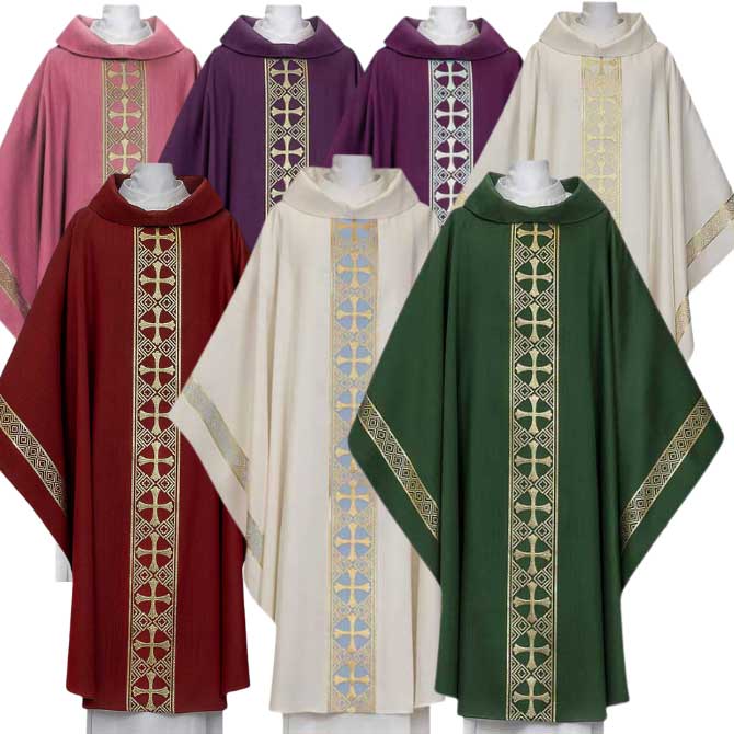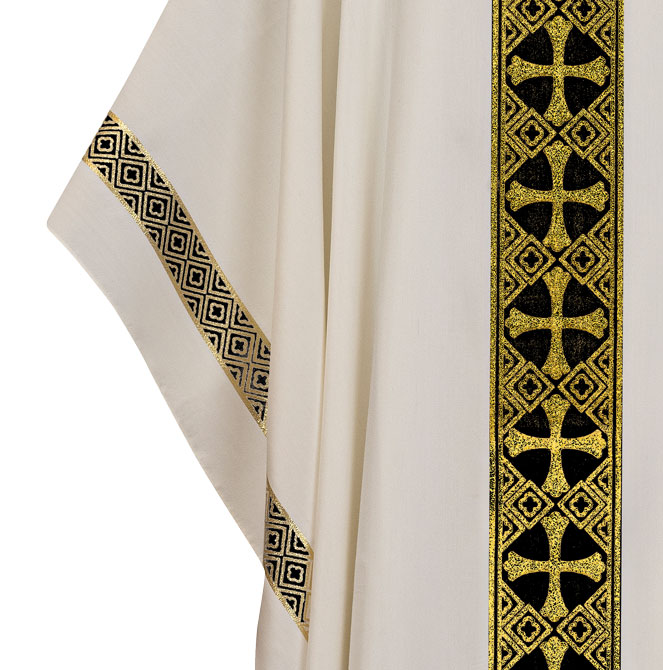 White/Black Chasuble from the Arte Houssard Collection made in a beautiful, lightweight wool blend (80% polyester, 19% wool, 1% lurex). The orphrey has a black cross design on the front and back. There is a simple, yet elegant, black band design at the sleeve. Comes with an Inside Stole. Ample Gothic Cut. Standard size is 53" length x 61" width. Sold here in White/Black. Shown with cowl neck, also available with plain neck. Please select neck finish. Other matching ecclesiastical vestments are available. Please inquire to info@cosgraves.net or 800-228-9785. This item is crafted in France and imported from Belgium. It is subject to appropriate declaration, duties, tariffs, and taxes required by U.S. Customs. To ensure your order is appropriately charged, or exempt, please include your FEI# in the comments section. NOTE: If you already have an established account with us we have this exemption number on file. Items shipped from Europe do NOT qualify for free freight.