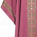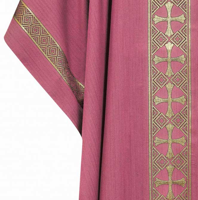 Rose Chasuble from the Arte Houssard Collection made in a beautiful, lightweight wool blend (80% polyester, 19% wool, 1% lurex). The orphrey has a gold cross design on the front and back. There is a simple, yet elegant, gold band design at the sleeve. Comes with an Inside Stole. Ample Gothic Cut. Standard size is 53" length x 61" width. Sold here in Rose. Shown with cowl neck, also available with plain neck. Please select neck finish. Other matching ecclesiastical vestments are available. Please inquire to info@cosgraves.net or 800-228-9785. This item is crafted in France and imported from Belgium. It is subject to appropriate declaration, duties, tariffs, and taxes required by U.S. Customs. To ensure your order is appropriately charged, or exempt, please include your FEI# in the comments section. NOTE: If you already have an established account with us we have this exemption number on file. Items shipped from Europe do NOT qualify for free freight.