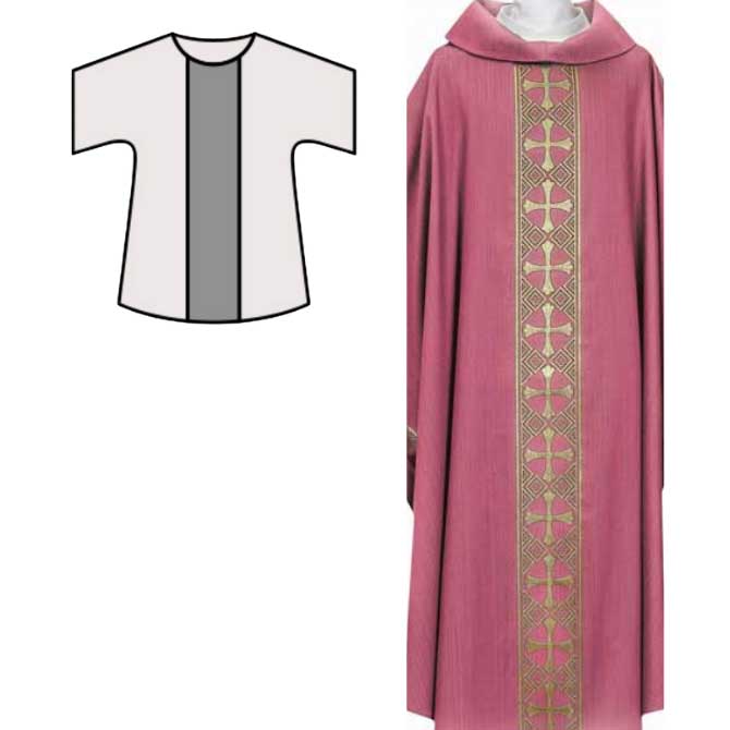 Rose Dalmatic from the Arte Houssard Collection made in a beautiful, lightweight wool blend (80% polyester, 19% wool, 1% lurex). The orphrey has a gold cross design on the front and back. Comes with an Inside Stole. Sold here in Rose. Shown with cowl neck, also available with plain neck. Please select neck finish. Other matching ecclesiastical vestments are available. Please inquire to info@cosgraves.net or 800-228-9785. This item is crafted in France and imported from Belgium. It is subject to appropriate declaration, duties, tariffs, and taxes required by U.S. Customs. To ensure your order is appropriately charged, or exempt, please include your FEI# in the comments section. NOTE: If you already have an established account with us we have this exemption number on file. Items shipped from Europe do NOT qualify for free freight.