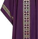 Purple Chasuble from the Arte Houssard Collection made in a beautiful, lightweight wool blend (80% polyester, 19% wool, 1% lurex). The orphrey has a gold cross design on the front and back. There is a simple, yet elegant, gold band design at the sleeve. Comes with an Inside Stole. Ample Gothic Cut. Standard size is 53" length x 61" width. Sold here in Purple. Shown with cowl neck, also available with plain neck. Please select neck finish. Other matching ecclesiastical vestments are available. Please inquire to info@cosgraves.net or 800-228-9785. This item is crafted in France and imported from Belgium. It is subject to appropriate declaration, duties, tariffs, and taxes required by U.S. Customs. To ensure your order is appropriately charged, or exempt, please include your FEI# in the comments section. NOTE: If you already have an established account with us we have this exemption number on file. Items shipped from Europe do NOT qualify for free freight.