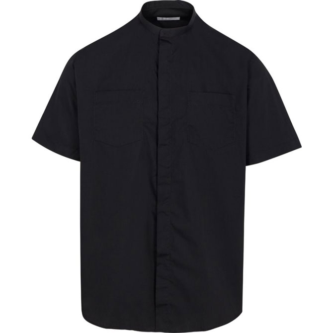 Neckband Short Sleeve Clergy Shirt. Use with #96-97_Collarette. This high-quality black shirt features a full-cut design, short sleeves, and two breast pockets. It is tailored to provide a perfect fit for various body types. Ecclesiastical Apparel offers high quality shirts using an exquisite fabric and superior craftsmanship. The luxurious 65% polyester and 35% cotton fabric will help to keep you cool and comfortable while being easy to care for. High quality dyes and yarns help maintain the color. It all comes together to form a top-quality shirt at a reasonable price. Ethically produced in Africa, this shirt supports fair labor practices by providing living wages and healthcare to its workers, making it a responsible choice for those in the ministry. Available in sizes ranging from 14 to 20-1/2" neck. Please select.